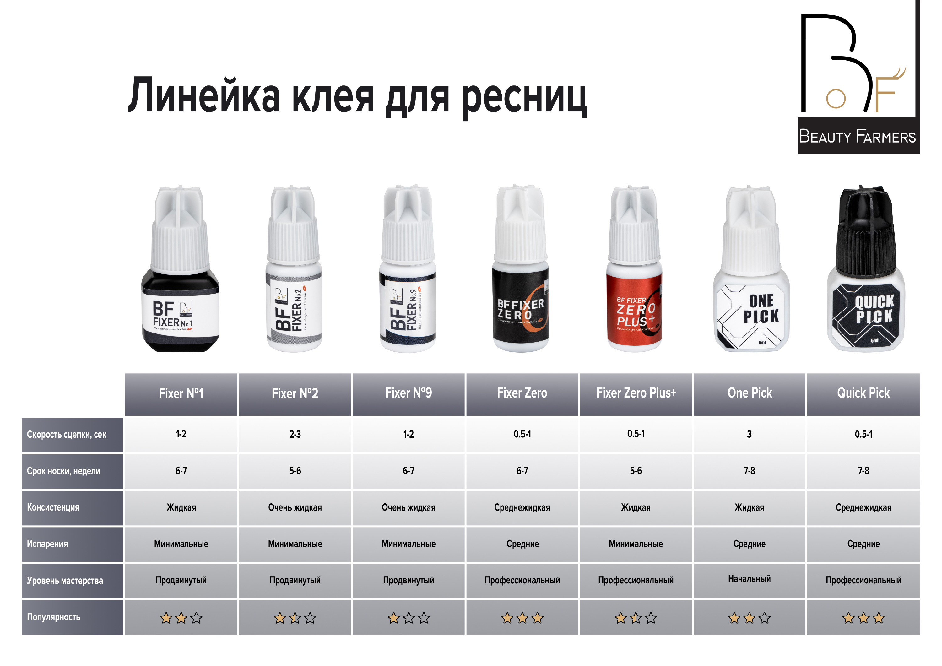 Клей для наращивания ресниц Beauty Farmers BF №9 Fixer - высокоэластичный клей с очень жидкой консистенцией и минимальными испарениями. Скорость сцепки - 1-2 сек. Срок носки ресниц - 6-7 недель.