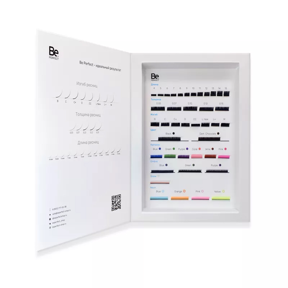 Мы собрали весь ассортимент ресниц Be Perfect в одном месте. Удобный и практичный демонстратор ресниц собрал воедино все цвета, изгибы, длины и толщину искусственных ресниц. Каждую ленту с ресничкой можно потрогать и ощутить мягкость волокна, а также сравнить изгибы и подобрать то, что нужно.